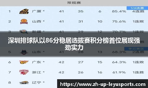 综上所述,深圳排球队以86分稳居选拔赛积分榜首位,是多方面因素共同作用的结果。从整体实力到细致入微的战术安排,再到每位球员独特闪光点,以及教练团队的重要支持,都构成了这支队伍成功的不竭动力源泉。